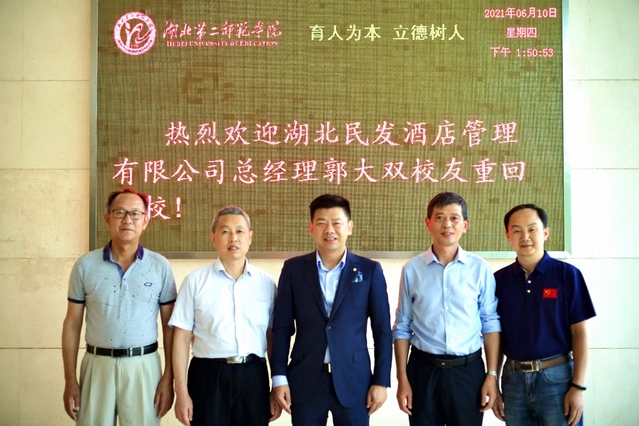 恰逢建党百年之际,湖北第二师范学院建校90周年,6月10日,管理学院特邀优秀校友郭大双返校与学院师生叙情谊,谋发展。财务处处长王诗龙,管理学院院长夏仕平、分党委书记戴正华出席,酒店管理系专业教师、学生代表参会。